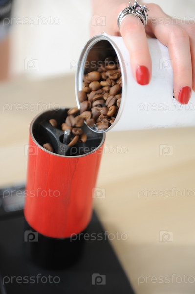 Девушка-бариста наливает кофе из белой банки в красную ручную кофемолку крупным планом