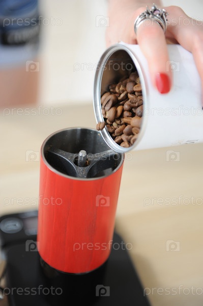 Девушка-бариста наливает кофе из белой банки в красную ручную кофемолку крупным планом