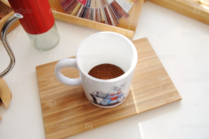 Заваривание кофе в кружке. Свежемолотый кофе в чашке, вид сверху