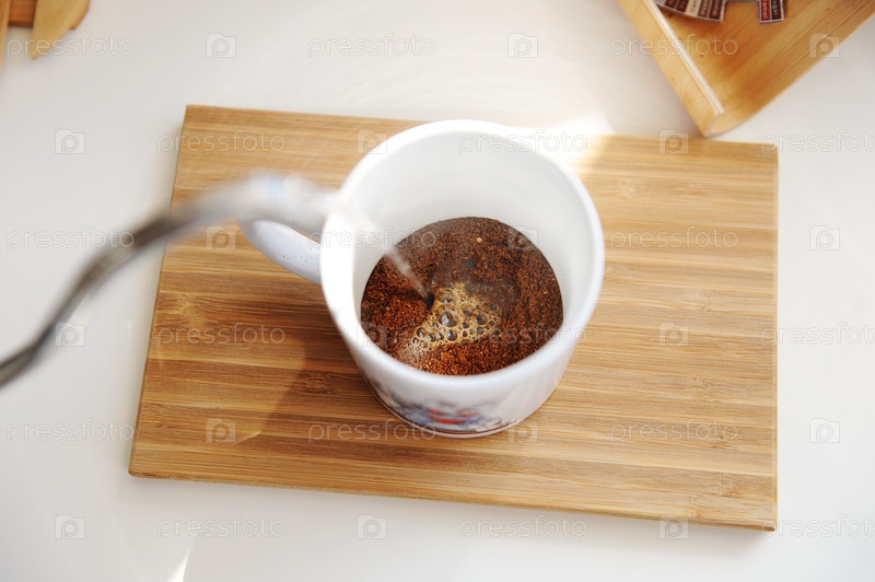Заваривание кофе в кружке. Выливание воды из чайника на гусиной шее в чашку со свежемолотым кофе, вид сверху