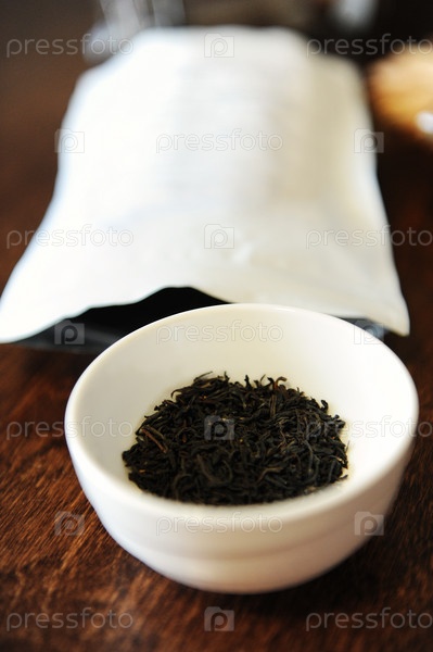 Скрученные листья черного чая в белой миске рядом с белой упаковкой со свободным местом для дизайна