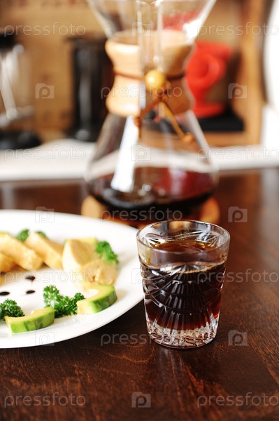 Завтрак с кофе. Модный старомодный хрусталь. Японский омлет с авокадо и зеленью на белой тарелке. Ручное альтернативное заваривание
