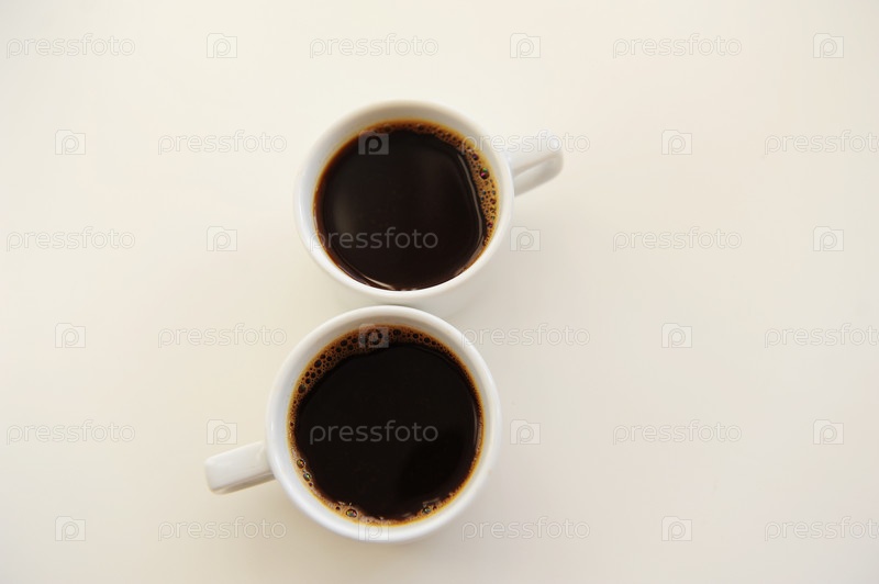 Черный кофе в двух белых чашках в форме восьмерки на белом фоне