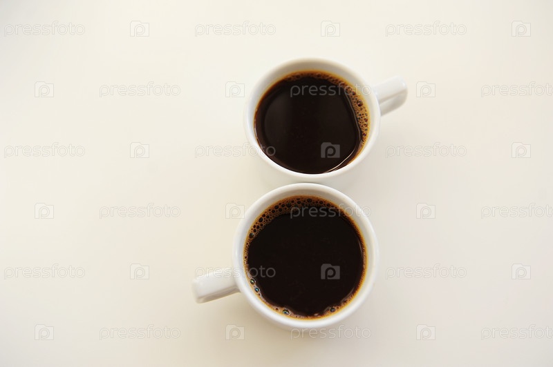Черный кофе в двух белых чашках в форме восьмерки на белом фоне