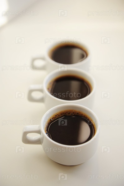 Черный кофе в белых чашках на белом фоне