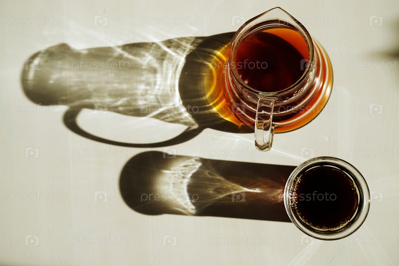 Эстетика спешиалти кофе третьей волны. Свежезаваренный черный налейте кофе на залитый солнцем белый стол