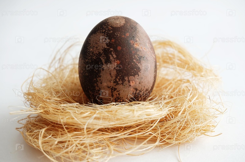 Коричневое мраморное пасхальное яйцо на кокосовом волокне на белом фоне крупным планом