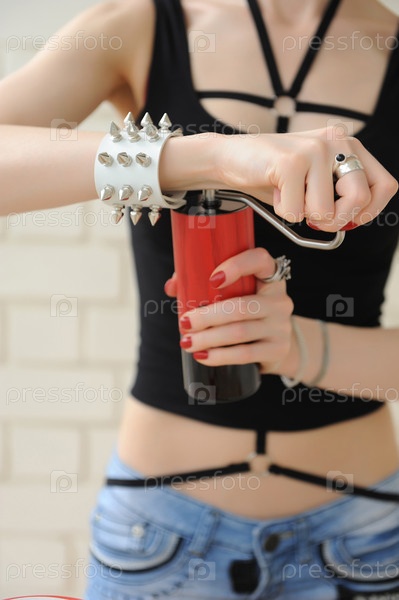 Молодая красивая девушка-бариста мелет кофе красной ручной кофемолкой крупным планом без лица