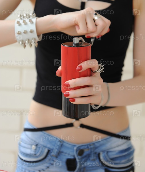 Молодая красивая девушка-бариста мелет кофе красной ручной кофемолкой крупным планом без лица