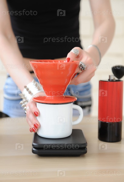 Девушка-бариста заваривает капельное кофе в красной бутылке v60 hario крупным планом без лица. ручная шлифовальная машина