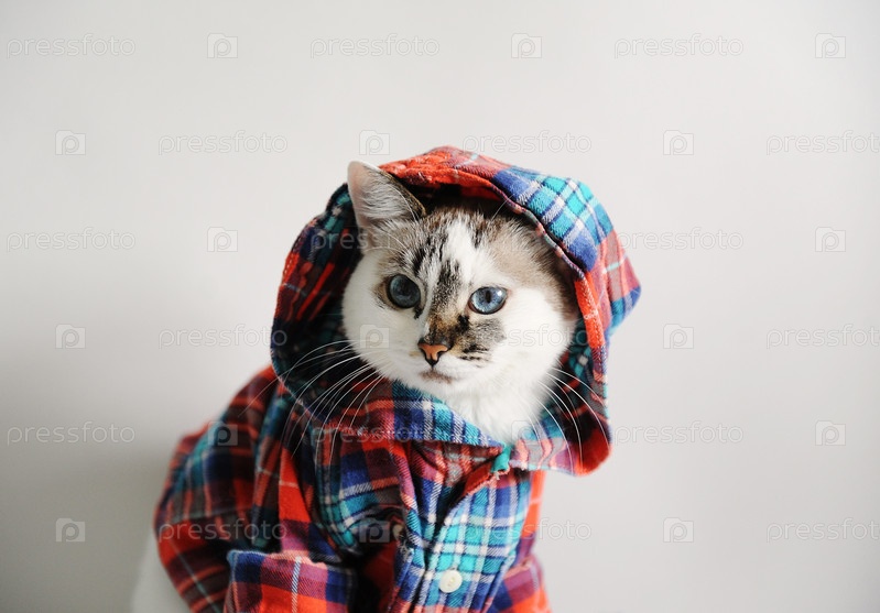 Белый пушистый голубоглазый кот в клетчатой рубашке с капюшоном на светлом фоне. Портрет крупным планом