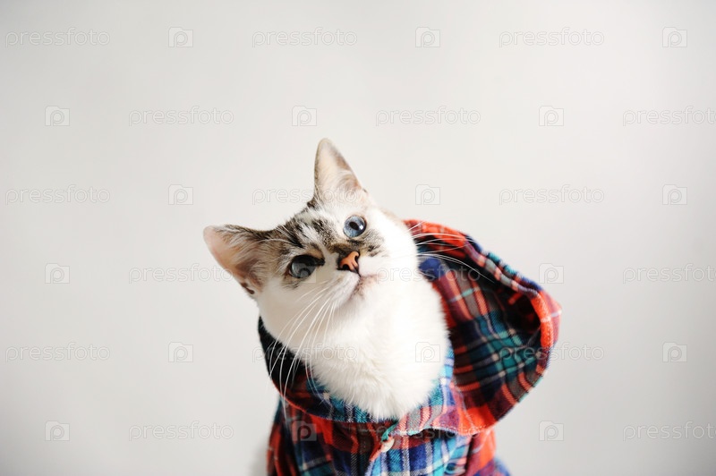 Белый пушистый голубоглазый кот в клетчатой рубашке с капюшоном на светлом фоне. Портрет крупным планом. Свободное пространство для дизайна
