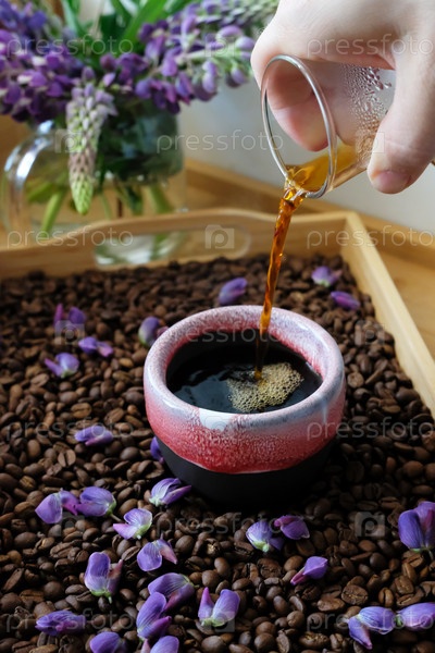 Свежезаваренный пуровер-кофе переливается в глиняную керамическую чашку из стеклянного графина. На подносе с кофейными зернами и лепестками цветов