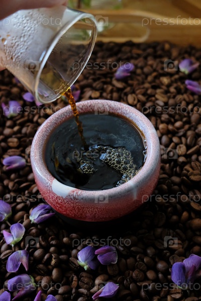 Свежезаваренный пуровер-кофе переливается в глиняную керамическую чашку из стеклянного графина. На подносе с кофейными зернами и лепестками цветов