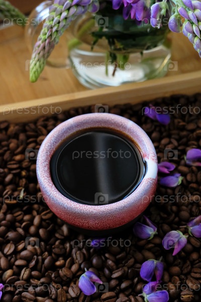 Черный кофе подается в глиняной чашке на подносе с кофейными зернами и лепестками цветов