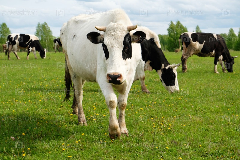 Белая корова с черными пятнами на переднем плане на фоне остального стада. Пасутся на летнем сочном зеленом лугу