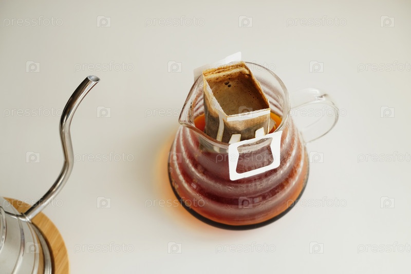Процесс заваривания кофе в капельном мешке, вид сверху. Легкий простой метод заваривания, новая тенденция
