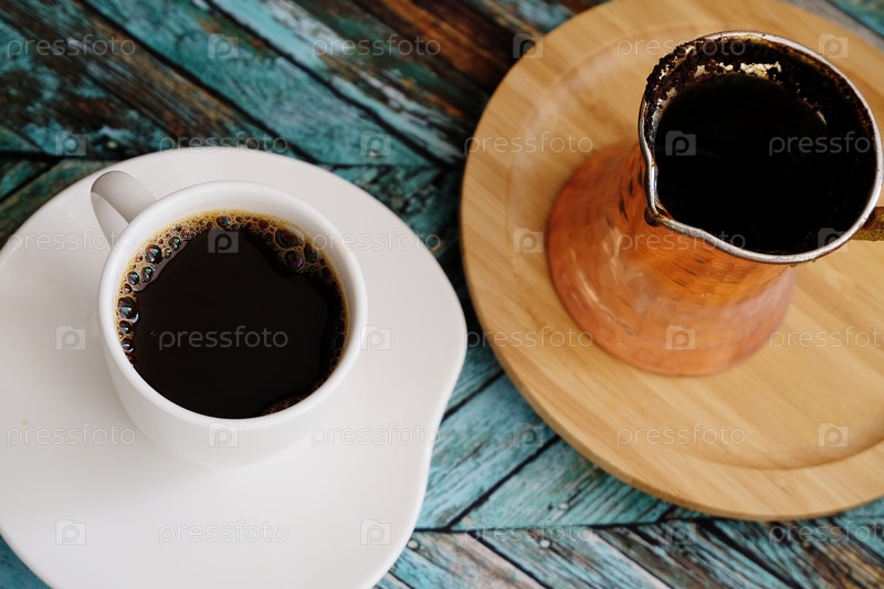 Черный кофе подается в белой чашке. Медная турка на бамбуковой подставке. Традиционный турецкий метод