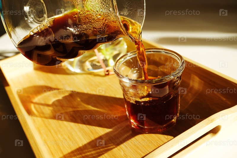 Свежезаваренный черный кофе наливают в стеклянную чашку на бамбуковом подносе под солнечным светом