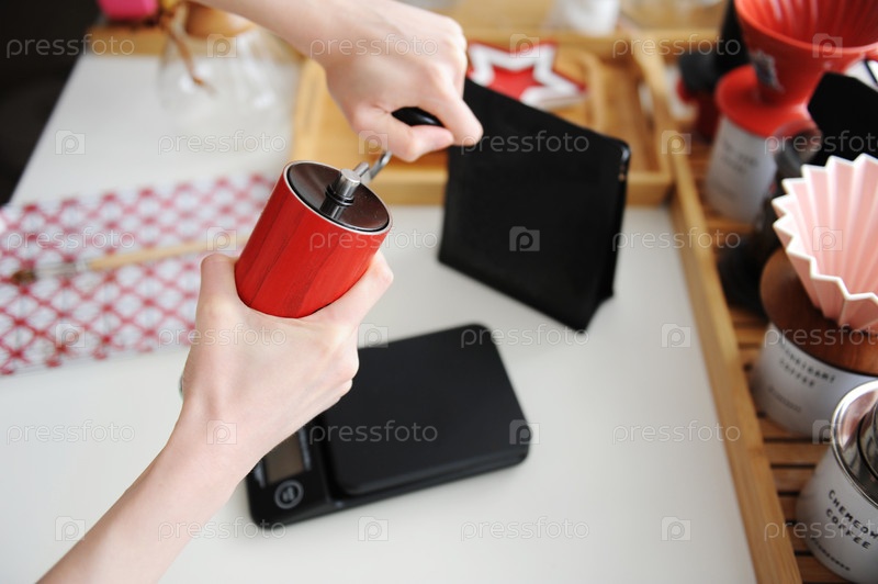 Натюрморт с варкой кофе. Красная ручная мясорубка. Черный пакет со свободным местом для логотипа. Специализированная эстетика третьей волны