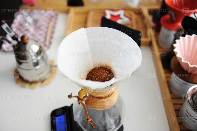 Альтернативный натюрморт с ручным завариванием кофе. Молотый кофе в капельнице с бумажным фильтром. Специализированная эстетика третьей волны
