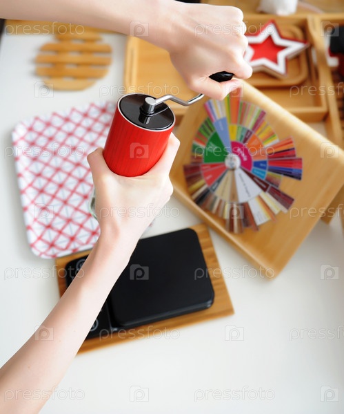 Альтернативный пивоваренный натюрморт. Помол кофе в красной ручной кофемолке. Концепция специализированной эстетики третьей волны