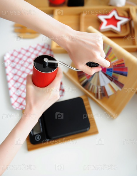 Альтернативный пивоваренный натюрморт. Помол кофе в красной ручной кофемолке. Концепция специализированной эстетики третьей волны