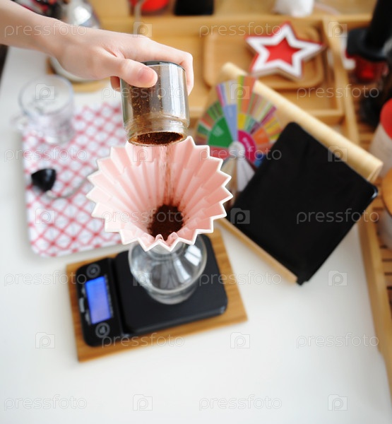 Альтернативный пивоваренный натюрморт. Заливка молотого свежего кофе в розовую керамическую капельницу оригами с фильтром бумажной волны