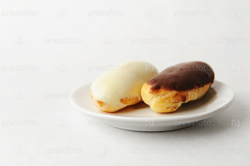 Два эклера на белом блюдце на белом фоне изолированы. Свободное место