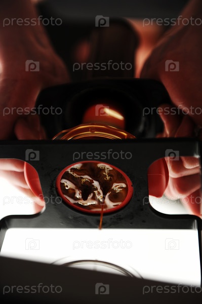 Эспрессо из ручной кофеварки, вид снизу, крупный план
