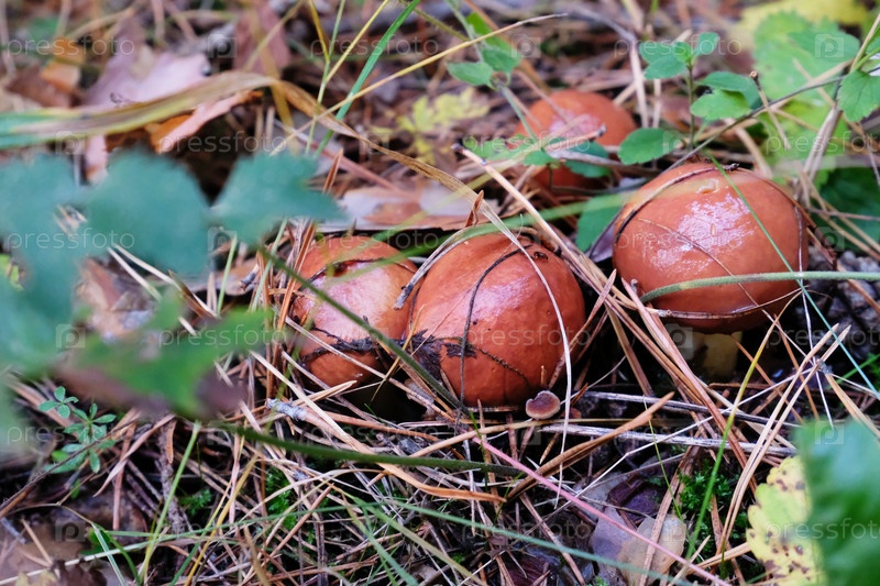 Скользкие грибы на земле в осеннем лесу