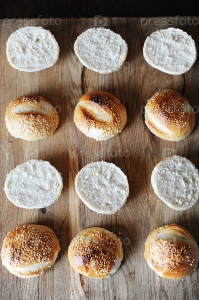Булочки с кунжутными бургерами разделены пополам на деревянной разделочной доске, вид сверху. Процесс приготовления