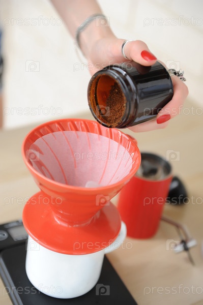 Девушка-бариста наливает свежемолотый кофе из ручной кофемолки в красный поувер с бумажным фильтром крупным планом
