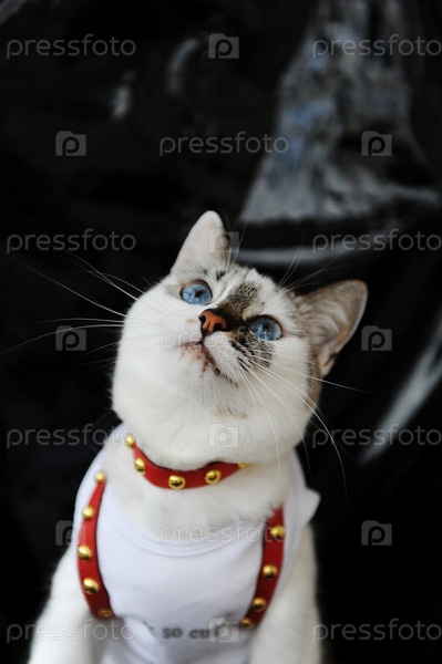 Белый голубоглазый милый кот, одетый в футболку и красную кожаную упряжь. Стильный наряд с аксессуарами. Черный фон