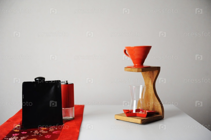 Концепция китайского фирменного кофе. Ручное заваривание. Традиционная китайская скатерть с узором из ткани. Деревянная капельная станция