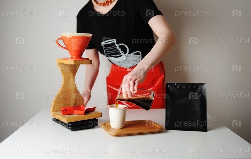 Модная девушка-бариста подает фильтрованный кофе. Капельная станция для дерева. Красная лакированная юбка, черная футболка. Место для дизайна