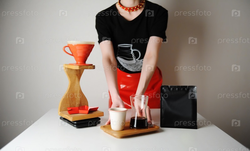 Модная девушка-бариста подает фильтрованный кофе. Капельная станция для дерева. Красная лакированная юбка, черная футболка. Место для дизайна