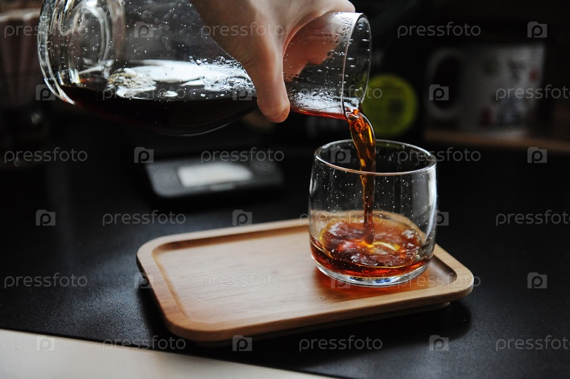 Ручной пивоваренный натюрморт. Наливание фильтр-кофе из графина в стакан. Бамбуковый поднос. Специальная эстетика третьей волны