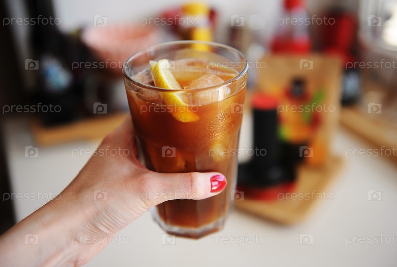Эспрессо-тоник с ломтиком лимона в стакане со льдом в женской руке крупным планом