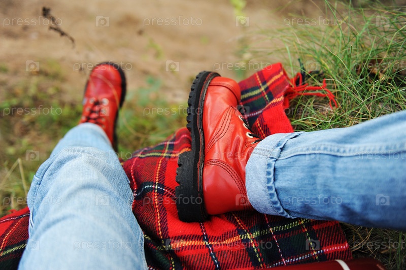 Эстетика туризма. Красные сапоги, клетчатый плед на осенней природе, ноги крупным планом