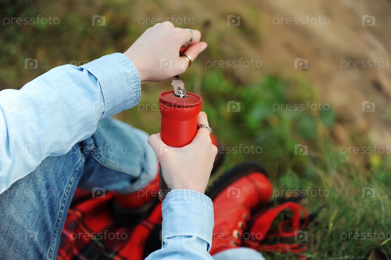 Эстетика кофе на открытом воздухе. Красная ручная мясорубка в руках крупным планом. Красные сапоги, клетчатый плед на осенней природе