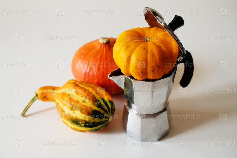 Концепция осеннего кофе. Горшок мока с тыквой. Изолированный