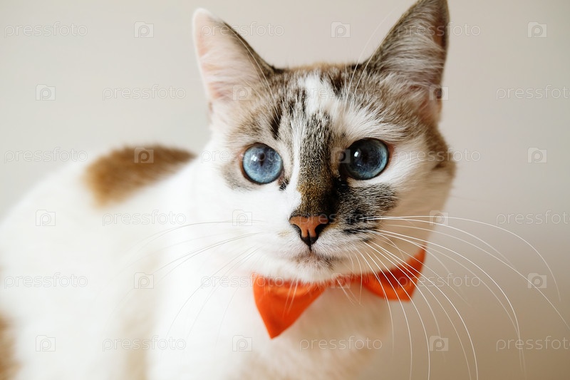 Белый голубоглазый кот в оранжевом галстуке-бабочке, портрет на белом фоне