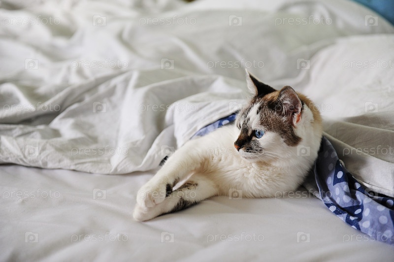 Белый пушистый голубоглазый кот лежит в постели, покрытый одеялом
