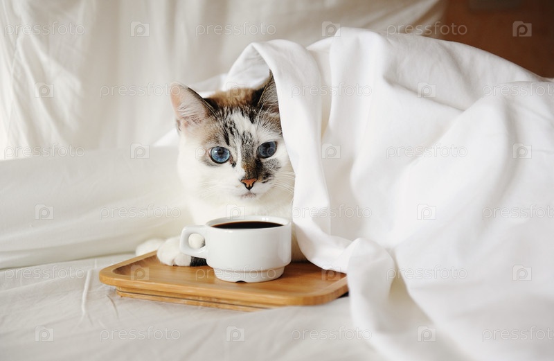 Утренний пробуждающий кофе в постель. Милый кот тянется за чашкой кофе