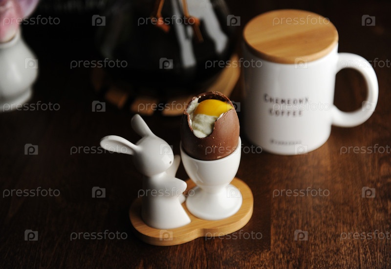 Пасхальные десертные шоколадные яйца с начинкой из крема, имитирующего белок и желток. Подается на подставке с пасхальным кроликом