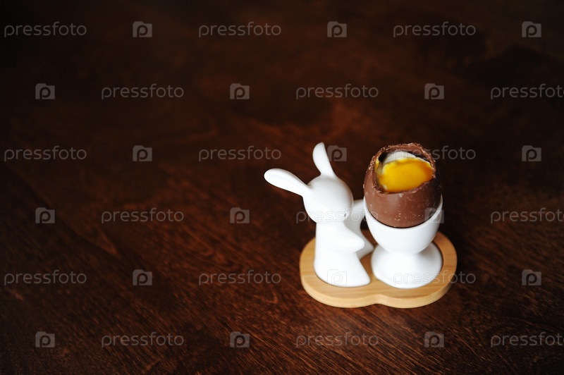 Пасхальное десертное шоколадное яйцо с кремом, имитирующим белок и желток. Держатель с кроликом. Деревянный фон, свободное пространство