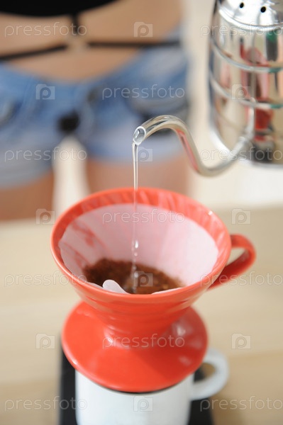 Девушка-бариста заваривает кофе капельным методом. налив воды из чайника на гибкой шее в красную воронку hario v60