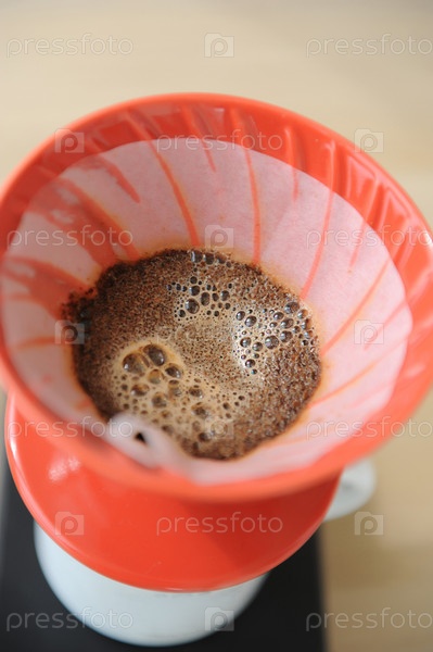 Свежий кофе цветет в красной воронке hario v60