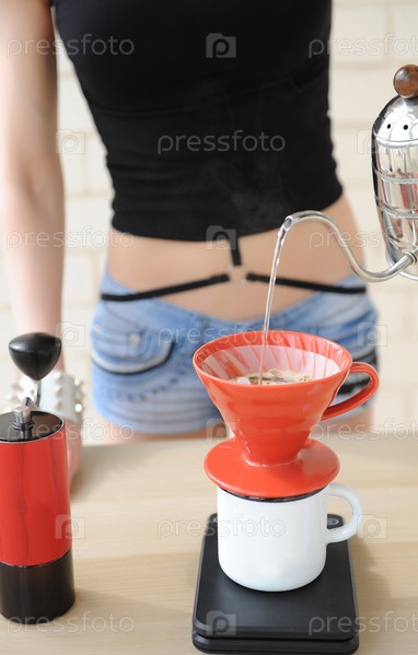 Девушка-бариста заваривает кофе капельным методом. налив воды из чайника на гибкой шее в красную воронку hario v60